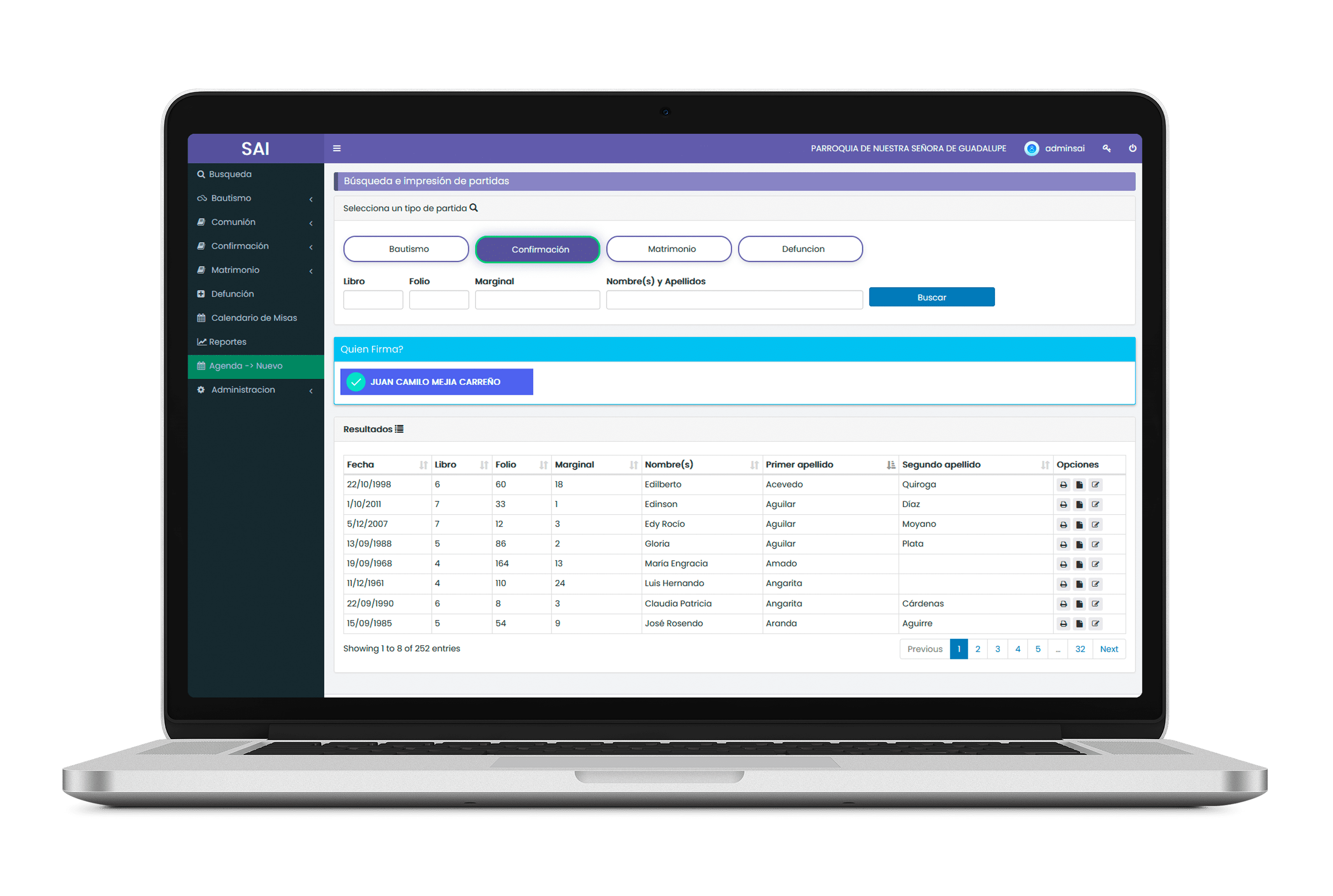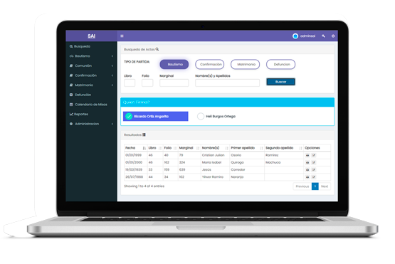 SAI es un sistema multi-usuario el cual puede ser usado por sacerdotes, secretarias, auxiliares de digitación y todas aquellas personas que la parroquia desee, el sistema posee un administrador de usuarios en el cual se pueden crear, activar e inactivar